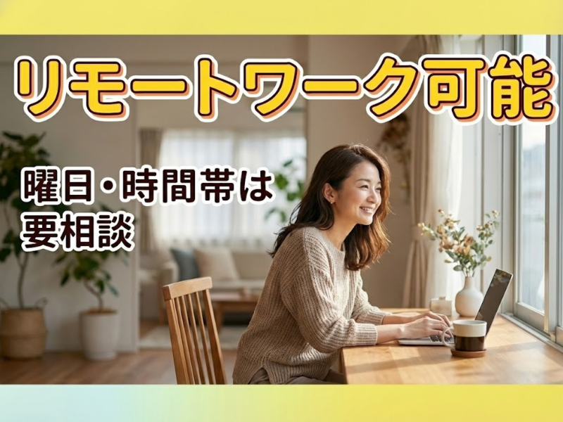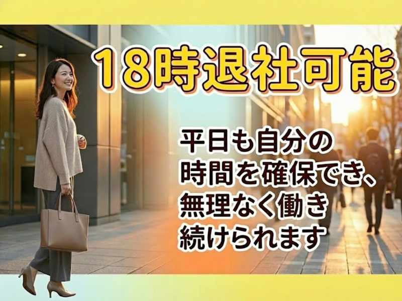 アピールポイント: ーーーーーーーー 当社で働く5つの魅了 ーーーーーーーー ①月給25万~30万円 しっかりと固定給を得ながら、新たなキャリアをスタートできます ② 完全週休2日(土日) 土日は休めるため、プライベートの予定も両立しやすい ③ 18時退社可能 平日も自分の時間を確保でき、無理なく長く働き続けられます ④ リモートワーク可能 出社と在宅を組み合わせて柔軟な働き方ができます※曜日・時間帯は要相談 ⑤ 服装・髪型・ネイル自由 型にはまらず、自分らしいスタイルで仕事に向き合える環境です
