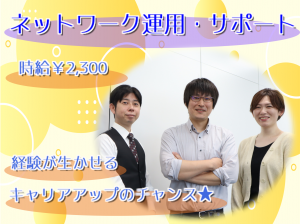 インフォメーション ★はたらくスタート応援金5万円支給★高時給2,300円~ IT経験を活かしてキャリアアップ! NECネッツエスアイグループ ■はたらくスタート応援金5万円支給 ■定期健康診断(基本健診・人間ドック等)全額会社負担 ネットワークの運用管理業務、保守技術者の手配やサポート業務をお任せします 現場にはマニュアルもあり、安心してお仕事をスタートしていただけます 先輩社員にOJTで教えてもらいながら、スキルを身につけてください! アピールポイント こちらはオススメ求人です! \子育てもしっかり支援!/ ■妊娠障害休暇、妊娠中の通勤緩和処置 ■子の看護休暇:1年に5日(子1人)または10日(子2人以上) ■育児短時間勤務:小学校3年生を終了するまで所定労働時間を2時間まで短縮可能(規定あり) ■相談窓口 ■育休推進開催 ■保育所利用制度(企業主導型保育所の共同利用) など ★2021年:子育てサポート企業の証「くるみん」認定を取得!