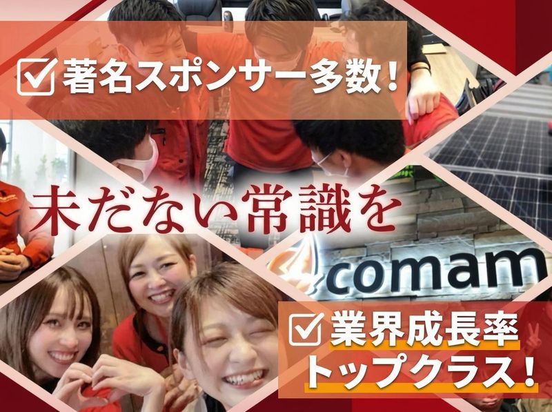 職場環境 【営業経験者は、”今”が最高のタイミング】 国が本気で推進する市場拡大期だからこそ、ポジションも収入も獲得しやすいタイミング。当社は2031年にIPOを見据え、営業組織を積極強化中です。「もっと成長したい…!」そんな想いを持つ方、comamで働きませんか?