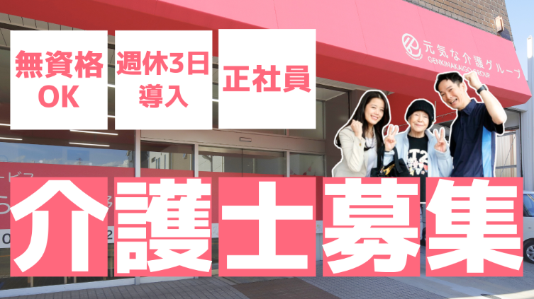 PRコメント \\ 元気な介護は、働きやすさに自信あり! // ✅ 有休が取りやすい環境 ⏩ 有休消化率84.5%で、プライベートも充実! ⏰ 残業ほぼなし ⏩ 平均残業 月2.75時間。無理なく働けます。 ⭐ 週休3日制も選択OK ⏩ 年間休日155日(事業所による)。働き方が選べます! ✋ 長く働ける職場 ⏩ 定着率85.3%。安心して続けられる環境です。 ✨ 元気チャージ月間 ⏩ 年間20,000円の会社負担でリフレッシュできる福利厚生♪ ※上記データは2024年度の社内実績に基づいています。 【仕事内容】 ご利用者様の「IADL」向上を目指しています!日常における生活介助から、利用者さんが楽しんでもらえるようなレクリエーションの企画・進行を行っていただきます!資格、経験がなくても研修制度が整っているので大丈夫です!送迎については専属のドライバーさんがいるのでございません。 ■入社後、仕事内容が変更となる予定はございません。
