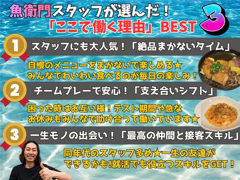 仕事内容 ☆ ★ ☆ ★ ☆ ★ ☆ ★ ☆ 初バイトOK⭐学生さん活躍中 絶品まかないが毎日食べられる! 「交友関係を広げたい」も大歓迎✨ ☆ ★ ☆ ★ ☆ ★ ☆ ★ ☆ 海鮮×天ぷら 魚衛門(ぎょえもん)では、春の新しいスタートを応援! この機会に新しい仲間を迎え入れ、一人ひとりを大切にゆっくり育てていきたいと思っています✨ <こんなお仕事です> ✅お客様のご案内 ✅オーダー取り ✅料理の配膳・下膳 ✅テーブルの片付け ✅ドリンク作り まずは簡単なことからお願いしていきます。 初バイト大歓迎!飲食店での経験不問♪ 「できることから、ひとつずつ」でOKです!(^^)! 接客マナーやスキルを身につけてステップアップができる環境です! 慣れてくれば臨機応変に対応ができるようになっていきますよ◎ +・・―✨大学生が活躍中✨―・+・・ 高校に入ったばかりの新1年生から始めた先輩も、今では後輩たちをサポートする頼れる先輩としてお店を盛り上げてくれています♪ 歳の近い先輩たちが優しくフォローしてくれるので、初バイトでも心配いりません! 接客マナーを身につけられるので、就活に役立った!と話す先輩も♪ 仕事の話はもちろん、「授業が思ったより大変…」「サークル選びにまだ迷ってる」そんな相談や、プライベートの話にも親身になってくれる居心地抜群の環境です♪ みんな仲が良くてアットホームな雰囲気が自慢なので、「新しい友達が欲しい」「交友関係を広げたい」という方も大歓迎です♪ 手作りの美味しいまかないも毎日食べられますよ!! 新しい春を迎えるこのタイミングで働き始めてみませんか?✨ +・・―✨一人ひとりを大切に✨―・+・・ 魚衛門では、 いきなり忙しい時間帯から任せることはしません。 ▼ ⭐ 落ち着いたタイミングでスタート ⭐ 先輩が横について丁寧にサポート ⭐ 未経験前提の研修あり 「新しい職場でちゃんとできるかな…」 「久しぶりの仕事復帰で不安…(>_<)」 「ホール業務をほとんどしたことがない…」 そんな方も、安心して始められます✨ \お店の雰囲気はInstagramで✅/ スタッフや店内の様子を載せています! Instagram:@sun.root1201 https://www.instagram.com/sun.root1201/