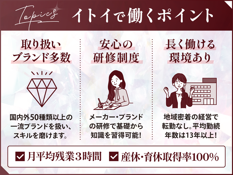 仕事内容 \ 未経験歓迎!20~40代女性活躍中 / ** 入社2年目で年収450万円も可能 ** 当社のオリジナルジュエリーは 女優やアナウンサーも着用しています! 《第二新卒歓迎》社会人経験が浅くてもOK 《女性活躍中》産休・育休取得率100% 《残業ほぼなし》月平均残業時間3h 《長く働ける》転居を伴う転勤なし ==================== 正規取扱店として、国内外50種類以上の 一流ブランドを取り扱う当店で ジュエリーの販売をおこなっていだきます! ――――――――― 【 具体的には 】 ――――――――― ・お客様へのヒアリング ・ブライダルジュエリー、 ファッションジュエリーの提案・販売 ・田中貴金属特約店業務 ・店頭商品の管理 ・顧客情報の管理 ・ディスプレイ ・田中貴金属特約店の業務 など ジュエリーは一生ものですので 接客はじっくりと時間をかけて行います。 ご来店されるお客様は、結婚や記念日、 人生の節目にプレゼントされる方など、 世代も目的もさまざま。 どんな目的でご来店されたのか、 どんな商品をお探しなのかを丁寧に ヒアリングし、お客様のスタイルや 好みに合うジュエリーをご提案しましょう! ―――――――――――――――― 【 未経験でも安心の教育体制 】 ―――――――――――――――― 入社後はメーカー・ブランド研修を通して ジュエリーの基礎知識やブランド特徴などの 商品知識を身につけていきます。 先輩と練習し、慣れてきたら接客スタート! 初めは先輩とペアで接客をおこないます。 ―――――――――――――――― 【 イトイグループについて 】 ―――――――――――――――― 北関東を中心にジュエリー販売事業や 飲食事業を手掛ける会社。 グループとしての売上は83億円を突破! 2019年には 「第3回全日本ジュエリーショップ大賞」を 受賞。業界のリーディングカンパニーです。