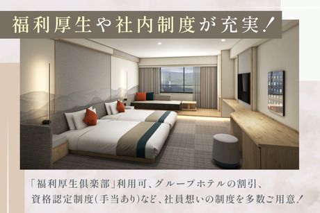 【保険制度】 雇用保険、労災保険、健康保険、厚生年金 待遇・福利厚生 【福利厚生】 *昇給年1回(4月)※昨年度評価・会社業績による *賞与年1回(3月)※会社業績による *交通費規定支給(上限5万円まで) *車通勤OK(駐車場あり) ※自賠責保険・任意保険加入必須 *退職金制度(正社員/全国型社員、かつ勤続2年以上) *「福利厚生倶楽部」利用可(全国レジャー施設・映画館・レンタカーなど割引対象) *グループホテル利用割引 *四半期ごとのCS個人褒賞制度(寸志あり) *社内資格認定制度(手当対象) *寮・住居応相談 *制服貸与 *研修制度 *当ホテルスタッフのみの特典として、 就業日の営業時間内なら、 勤務時間以外に大浴場・サウナの入浴OK!