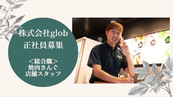 PR ◆「洋服の青山」の 青山商事グループ会社で安定 ◆若手育成中 20代、30代活躍中 飲食初めて&正社員初めて大歓迎 ◆残業少な目&1ヶ月毎の希望シフト制 残業は1日0~1、2時間程度で少ない ◆有給制度が充実 入社日に付与 4時間勤務で半日有給も可能です ◆待遇充実 退職金、確定拠出年金、 社保完備、賞与年2回など 「洋服の青山」でお馴染み、青山商事株式会社のグループ会社での正社員募集 2011年、洋服の青山の店舗余剰地を有効活用する為、 青山商事100%出資の完全子会社として誕生しました。 "小さな塊"を意味する「glob」という社名には、 大きな可能性を秘めた飲食業界という グローバルなマーケットへの挑戦を必ず成功させたいという決意が込められています。 globは、若く、またベンチャー企業のような攻めの姿勢と、 大企業のような安心感を兼ね備えています。 飲食の事業から始まり、 フィットネスやリユースショップまで 様々な柱があることで景気に大きく左右されることなく 社員やその家族の安定を守りながら 成長を続けています これから更に大切になってくるのは、個人の能力を最大限高めること。 それが会社全体の成長につながると確信しています チャレンジを楽しみ、共にglobの未来を創っていく仲間をお待ちしています 株式会社glob 採用HP:https://www.glob.co.jp/recruit Youtubeチャンネル:https://www.youtube.com/channel/UCmA6XdjESJ2ozjH1Jaxs0Ig