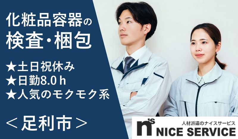 仕事内容 【軽作業】【モクモク作業】【未経験OK】【土日祝休み】【月収18.4万円可】 化粧品容器の検査・梱包(派遣社員・長期)新規募集 ▼勤務地 栃木県足利市<製造工場> *マイカー通勤可 *駐車場完備 *職場見学OK ▼ここがポイント ・軽作業&モクモク作業なのでストレスなく働けます ・人気の日勤&土日祝休み、完全週休2日でプライベートとの両立がしやすい ・未経験OKで時給1,150円の好待遇 ▼雇用・期間 派遣社員(即日~長期) *勤務開始日相談OK *即日(最短)勤務OK ・正社員雇用を目指している方、まずは派遣社員でスタートしてみませんか ・パート、アルバイトで仕事を探している方、条件面で比較してみてください ・長期で安定した仕事があります ▼求めるスキル ・未経験者OK!丁寧に指導します ・他業種からの転職OK! 接客、サービス、事務、オフィスワーク、清掃、警備、介護など、、、何でも相談して下さい! ・もちろん製造、工場経験者大歓迎!軽作業・組立・梱包などの仕事を探している方向き