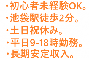 池袋駅から徒歩2分/専門スキル不要/土日祝休/男性女性活躍中/オフィスカジュアル/前払い制度アリ/応募⇒7日以内にお仕事を始められる。