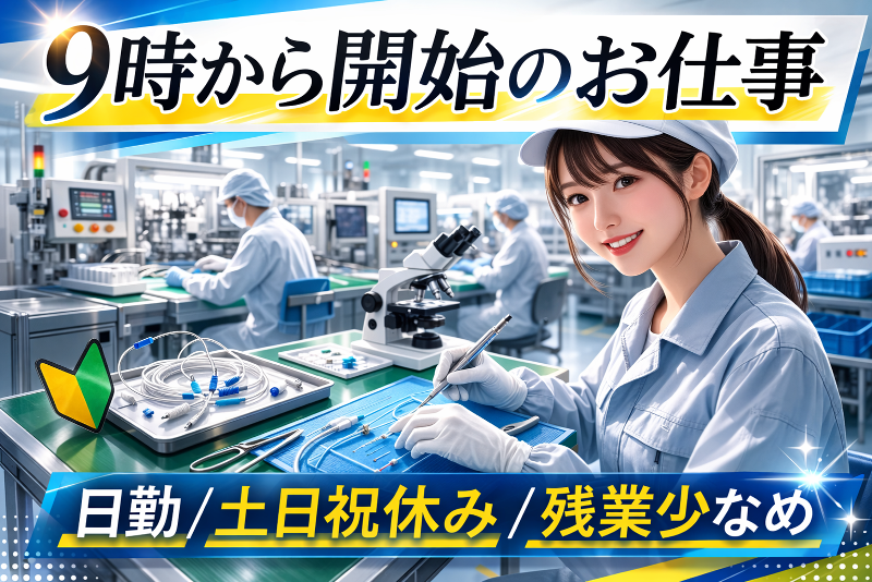 アピールポイント: 毎日の仕事は9時出社ですので平日の 忙しい朝も家庭の事をしっかり行って から時間に余裕を持って仕事に行けます! 日勤専属のお仕事ですが時給も高めで 無理なく安定的な収入が得られます! 残業も少ない企業ですので、 小さなお子さんがいる子育て世代の 方に大人気の職場となります! 世の中に必ず必要な医療製品の製造に関われます! 〇朝はユックリと9時から出社です! 〇日勤固定で土日祝は休日と年間休日多め! 〇残業少なめの職場です! 〇景気に強く長期安定的に勤務可能!