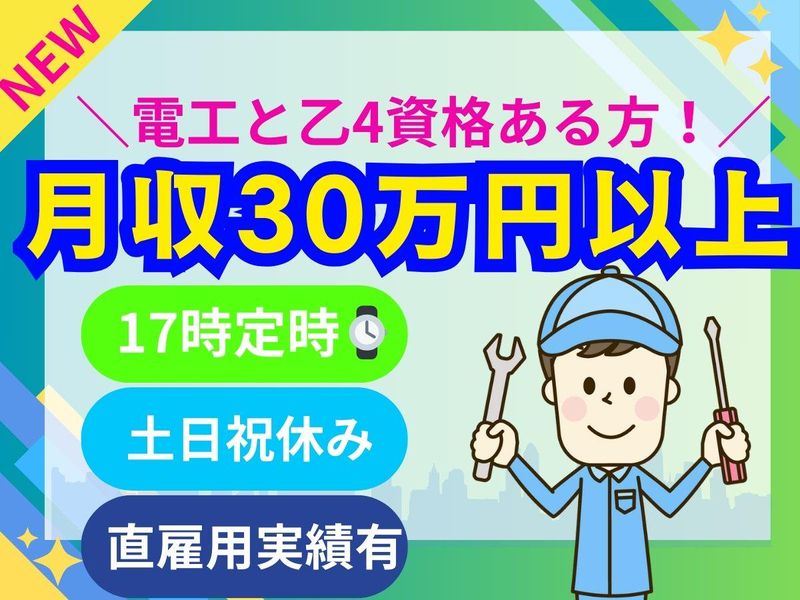 求めている人材 ✅【第一種電気工事士】 ✅【第二種電気工事士】 ✅【危険物取扱者乙種】 (【乙種第4項危険物取扱者】) などの 経験・技術をお持ちの方は即戦力!✊ ・保守・点検の実務経験がある方 30代~50代活躍中! <✨こんな方におすすめ♪✨>――₊⁺༚˚✧ 【土木施工管理】や【建築施工管理】、 【電気工事施工管理】【電気工事士】、 【設備管理】【施設保守】【設備保守】 【プラントメンテナンス】 などの経験者歓迎♪ ―――――――――――――――――₊⁺༚˚✧ ✅長期歓迎!長く働ける職場✨ ✅フリーター歓迎!シフト相談随時OK! ✅ブランク歓迎/ブランクOK✨ ✅経験者歓迎/経験者・有資格者歓迎! ✅U・Iターン歓迎 ✅月平均残業時間20時間以内⏰ ✅フルタイム歓迎