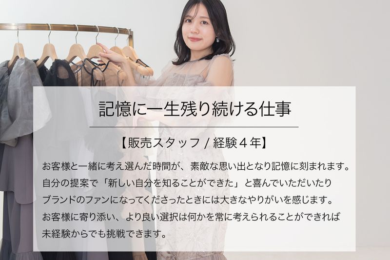 求める人材: アパレルや販売接客未経験者も大歓迎! 接客販売に関するマナーや商品知識、ドレスの専門知識等は研修にて丁寧に教えます。 【応募条件】 ・未経験OK ・アパレルやファッションが好きな方 ・人と話すことが好きな方 【歓迎条件】 ・アパレルでの接客販売経験