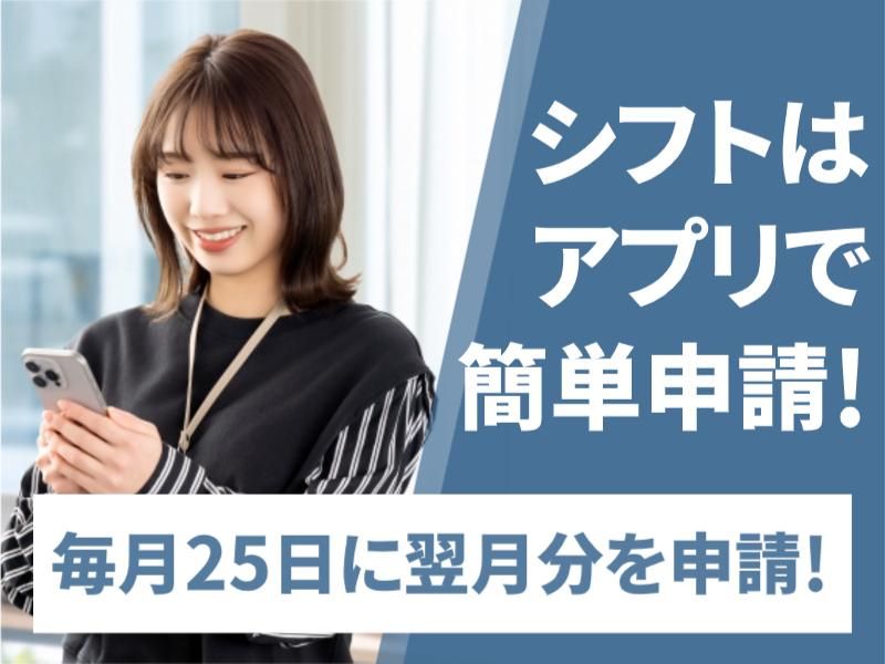 シフト制 勤務時間詳細 <勤務時間> 9:00~17:00の間で実働4h~の希望シフト制 (シフト例)9時~17時、10時~16時、10時~15時、11時~15時、13時~17時など ※シフトは毎月25日に翌月分の希望をアプリで送信! 送信後の変更も可能で、自分の予定や都合なども考慮した上で働ける♪