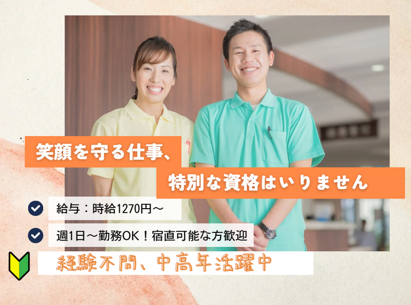 求めている人材 ◆宿直が可能な方・週末勤務可能な方歓迎 ◆料理が苦手な方でも大丈夫です! 既存施設では60代・70代以上の 中高年のスタッフも活躍中です☆ 先に応募いただいた方から 選考のご案内をさせていただき、 採用者が決まり次第募集を終了させて いただく場合がございます。 お早めの応募をよろしくお願いいたします。 グループホームの世話人さんを募集しています。 ほかの事業所との掛け持ちも可能で 週1回から勤務ができます。 「障がい福祉に興味がある」 「宿直が可能」な方は大歓迎です! 【こんな経験大歓迎】 ◎介護職 ◎介護職員 ◎介護スタッフ ◎パート ◎介護 ◎介護福祉士 ◎介護施設 ◎シニア活躍中 ◎中高年活躍中 ◎夜勤 ◎グループホーム ◎主婦パート 主夫パート ◎深夜バイト ◎夜勤専従介護 ◎福祉 ◎生活支援 ◎支援員