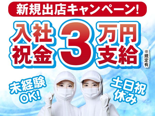 仕事内容 新規事務所開設にあたり 応募・面接でQUOカード500円 プレゼントキャンペーン実施中 ※規定有 <ポイント> ・新規出店キャンペーンにつき入社祝金3万円支給!※規定有 ・未経験OK ・給与前渡し制度あり(規定有) ・人気の土日祝休み ・日勤or夜勤選べます <お仕事詳細> 食品工場にて、冷凍食品やレトルトカレーの製造をするお仕事です。 以下の業務をお願いします。 ・材料の選別作業 ・トッピング作業 ・検査・包装作業 色々な作業の中から、ご自身に合った工程を選択できます。 食品を扱うため、クリーンスーツを着用しての作業です。 10代~50代まで、幅広い年代の男女が活躍中の職場です。 <未経験OK> 製造業や工場でのお仕事が未経験でも大丈夫! しっかりと教育致しますので安心して働くことができます。 <給与前渡し制度あり> 上限10万円までOK! 急な出費でお財布がピンチの時も安心のシステムです。