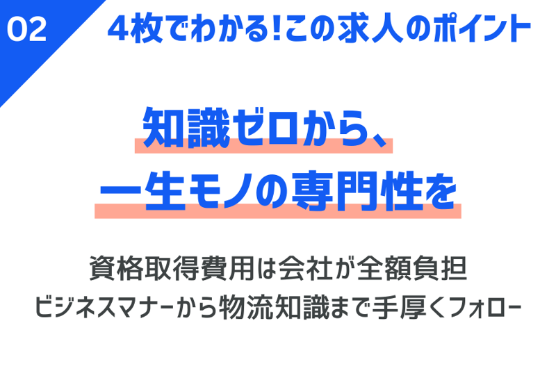 求める人材: 2026年4月から2027年3月までに、大学・短期大学・高等専門学校・専門学校を卒業(見込み)の方および第二新卒の方(卒業から3年以内) 専門知識やスキルは一切問いません! 入社後は、資格支援制度や先輩社員からのフォローを通してしっかりサポートします! ✅資格取得支援制度 資格取得や講習会等に参加する費用を会社が全額負担します。 例)日商簿記検定(3級・2級)、給与計算実務能力検定、ITパスポート他 ✅研修制度 ビジネスマナー研修だけでなく、就業規則等のルールや業務内容に沿った物流に関する知識の研修制度もあります。 また、年2回のキャリア面談により、社員一人ひとりのキャリアアップを支援します。