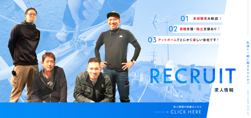 仕事内容 事業の拡大の為、一緒に楽しく働いて下さる電気工事士の方の募集となります。 電気工事士として活躍していた経験者の方はもちろん、業界未経験の方も大歓迎です! 「一緒に明るく!楽しく!」を合言葉に、私たちと働きませんか? <仕事内容> ・エアコン工事 ・アンテナ工事 ・LED照明工事 <未経験者大歓迎> どういった会社が自分に向いているのだろう…と悩んでいる方! 未経験の方でも、当社でしっかりとした技術やスキルを身につけることができます。 実際に、業界未経験から入社された先輩社員も活躍しています。 慣れるまでしっかり先輩社員が丁寧に教えますのでご安心ください。 一緒にお客様を笑顔にする仕事をしてみませんか? <資格取得支援してます> 資格支援に力を入れて取り組んでおります。 電気工事士の資格はもちろん、溶接や高所作業者などの、数々の資格の取得に向けてチャレンジすることが出来ます! また、未経験者の方に関しましては、一から丁寧に仕事内容などをお伝えしていきますので、ご安心下さい! 一つ一つ出来ることをコツコツ増やしていきましょう!! <独立応援します> 経験を積んで、将来、この業界で独立したいと考えている方を、弊社では応援しております! 将来のビジョンをしっかり持って働いている方に対して、しっかりとサポートをし、弊社の持っているノウハウや知識を最大限お伝えしていけたらと思っております。 向上心の高い、やる気のある方のご応募お待ちしております! <アットホームで楽しく仕事が出来ます> 毎年社員旅行を企画したり、食事会を定期的に行なったりと、社内イベントにも力を入れております。 社員同士のコミュニケーションの場として、みんなで楽しい時間を共有できたらと考えております。 優しい先輩ばかりですので、未経験の方でもすぐに打ち解けられると思います! 仕事もプライベートも充実させたい方のご応募お待ちしております。 <求職者の方へ一言> 私たちの仕事は、直接お客様と向き合い、自分たちの工事で、お客様を笑顔にすることが出来るお仕事です。 責任ある行動や技術を求められる場面は数多くありますが、とてもやりがいがある仕事だと思います。 経験豊富な代表のもとでは働き、ノウハウを教わることが出来ます。独立する為に必要なたくさんの経験が出来る会社です! 一緒にお客様を笑顔にする仕事やりませんか?