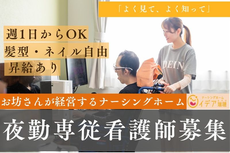 【仕事内容】 お坊さんが経営する緩和ケア型ナーシングホームの夜勤専従看護師を募集します! ■お仕事内容 緩和ケア型ナーシングホームの看護師としてターミナル期の入居者の看護業務をお任せいたします ■具体的な業務内容 ・健康状態の管理 ・治療促進のための看護 ・身の回りのお世話 ・ご家族への相談援助 ・退院後のアフターケア ・終末期の看護 ・報告書の作成(タブレット対応) など <PRポイント> ・28室の小規模施設だからこそ、一人ひとりの人生や想いに寄り添い、その方らしい時間を過ごしていただけるようサポートできる ・最新ICTを活用した効率的な業務運営で、スタッフの負担を軽減 ・夜勤専従でプライベートと両立しながら効率のよい働きが可能 ◎夜勤は看護師2名+介護士1名で対応するので安心! 夜勤のスタッフが多いので困ったことがあれば相談できる環境です。 ご入居の7割の方がガン末期の方のため、緩和ケアが中心となります。 単なる医療行為にとどまらず、心と体の両面を支える看護を実践できるのが大きな特徴。 「悔いを残して泣かない」をコンセプトに、スタッフとして利用者さまの人生の最後に向き合うことができる仕事です。 ご本人さまも、ご家族も、スタッフにも『悔いのないお看取りを』目指しています。 「目の前の方をよく見て、よく知る」――そんな関わりを大切に、看護師としてのやりがいを深く感じられるお仕事です。 イデア瑞穂では、心温まるケアを一緒に提供していける仲間を探しています。 Instagramで日々の日常を発信中です! ✅イデア瑞穂の様子を知りたい方は『ナーシングホームイデア瑞穂』で検索 ■株式会社ideinについて 名古屋市熱田区にある法正寺の副住職が経営する看護、介護事業。 それが私たちidein(イデイン)です。 看護、介護だけではなく、仏教での連携により、ココロもカラダも支え皆様の不安を少しでも緩和することができるよう努めています。 社名にもなっている ideinは、古代ギリシャ語の動詞「idea/イデア」(見る、知る)に由来します。 一人ひとりの望んでいる姿・想いを関わりの中で「よく見て、よく知って」その人らしい人生が送れるお手伝いができる存在になりたいー、そう思っています。