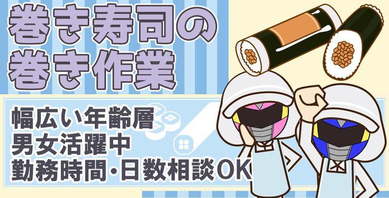 仕事の内容 【巻き寿司の製造スタッフ募集!未経験OK♪】 ★年齢・経験・性別問いません★ ★勤務時間・勤務日数の相談可能★ スーパーでよく見かける細巻きや太巻きの寿司をつくるお仕事です。 様々な世代が活躍している環境で、長期的に安定して働きたい方にピッタリです(^^)/ 【お仕事内容】 主なお仕事は、機械を使った巻き寿司の製造補助です。 作業の流れは以下の通りです (1) 機械の準備・セッティング →操作が簡単な機械のセットアップを行います。 (2) 材料の準備 →海苔や具材を準備し、炊きたてのご飯や酢飯を投入します。 (15kg程度の重さ) (3) 具材の投入 →巻き寿司形成ラインで具材を投入していきます。 (4) カット作業 →巻き上がった寿司を専用のカット機でスライス。 (5) パック詰め →仕上がった寿司をパッケージに詰めます。 (6) 機械洗浄・片付け →使用した機械の洗浄や作業エリアの片付けも担当します。 【働きやすい環境】 作業は一定の温度(19度)の場所で行うため、季節に関係なく快適です。 材料の取り出しで冷蔵庫や冷凍庫に行くこともありますが、 立ち作業中心なので体を動かすのが好きな方にオススメ! ほぼ機械作業なので、手順を覚えれば誰でもすぐに慣れます。 コツコツと集中して作業したい方、未経験も活躍中です。 【勤務条件】 ・シフト制 →週休二日制。 通常8:00~17:00の勤務ですが、出勤日数や時間は相談可能です! ライフスタイルに合わせて柔軟に働けます♪ 【待遇・福利厚生】 ・制服支給 →白衣、帽子、食品用シューズなどを支給します。 ・無料駐車場完備 →マイカー通勤も安心。 ・受動喫煙対策 →敷地内は禁煙です。 【職場の雰囲気】 年齢や性別、経験に関係なく、幅広いスタッフが活躍中です。 初めての食品製造でも、丁寧なサポートがありますので安心してスタートできます。 【こんな方におすすめ!】 ・体を動かすのが好きな方 ・長期間安定して働きたい方 ・モクモクとした作業が得意な方 ★本求人にご興味をお持ちの方は、応募する!より必須項目記載の上、 お問合せ下さい。 (お電話でのお問合わせ先:0120-67-3244 ※平日9時00分~18時00分)