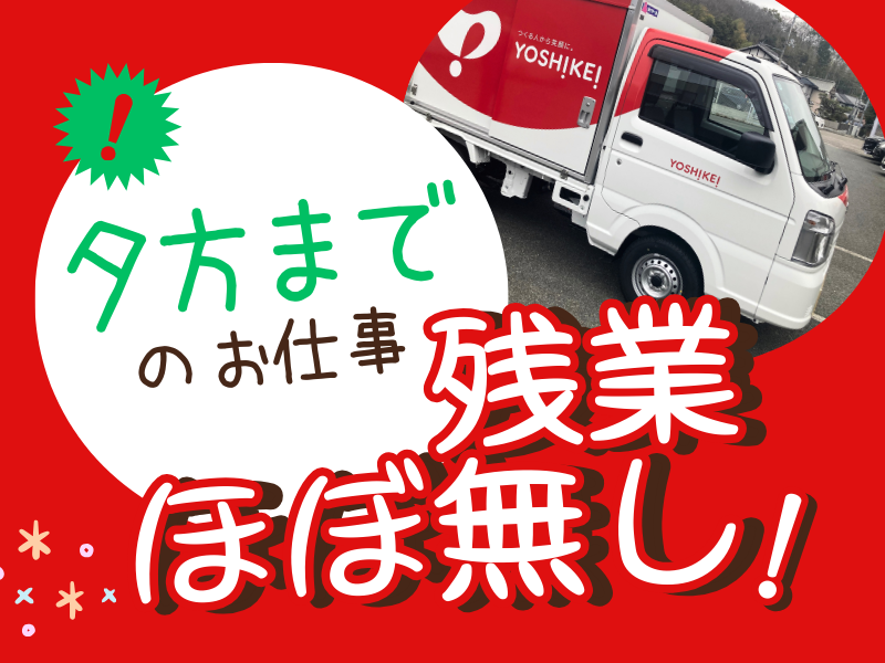 仕事内容 「子供が部活や塾で遅いから、その間にしっかり稼ぎたい!」 そんなお母さんスタッフが活躍中! 無理なく「正社員」にリターンできるレア求人◎ 土日祝休みなので、部活の応援も皆勤賞✊ 【40代・ミドル世代も再スタート中!】 ⭐久しぶりのお仕事復帰も大歓迎♪ ⭐入社日はあなたに合わせてOK(4月以降も) ⭐AT限定免許でOK!運転慣れしていれば大丈夫。 ✅具体的なお仕事内容 ―――――――――――――――――― 担当エリアの個人宅へ、夕食食材セットをお届けします。 商品部のスタッフが手伝うため、荷造りは不要◎ 基本は1人1ルートで、再配達もないため 道を覚えてしまえばかんたんです! ⭐「おしゃべり」が仕事の半分です。 お届け先は顔なじみのお客様ばかり◎ 「あら、いつもありがとう!」なんて、 世間話に花が咲くこともありますよ。 長年、地域やPTAで培った 「コミュニケーション力」が強みになります! ⭐夕飯の支度も余裕で間に合います。 17:45定時で、残業も少なめ! お子様が部活から腹ペコで帰ってくる前に、 夕飯の準備を整えて待っていられる時間です。 ⭐土日祝はちゃんとお休み! お子様の部活の試合観戦や、 送迎など家族サービスにも充てられます。 仕事と家庭、どちらも大事にできる環境です! ✅入社後の流れ ―――――――――――――――――― 入社後は、3日間の研修を実施します。 扱っている商品の特徴や お客様対応などを知っていただき、 先輩と実際のルートをまわりながら 配達業務を始めましょう! ドライバー業務が初めての方や、 社会人デビューも大歓迎! 困ったことがすぐに聞くことができ、 独り立ちした後でも 必ず連絡が取れる環境で働けるので 未経験でも働きやすい職場です。 ⭐業務に慣れてきたら… ―――――――――――――――――― 配達が空いた時間には、ポスティングや お客様への新規開拓もお任せしていきます。 無理なノルマは一切なし。 宅配食材が気になっているお宅に、 ヨシケイのメリットをお伝えできればOK◎ おきゃくさまはご高齢の方も多く、 食材の宅配だけでなく、 地域の見守り活動もしています。 ⭐夕食食材の配達について ―――――――――――――――――― 買い物に行くのも一苦労な方や、 毎日毎食、献立を考えて お料理をするのが億劫な方のために 生まれたのがこの食材宅配! 今後も需要が高まるこの業界で、 一緒に活躍していただける方を求めています◎