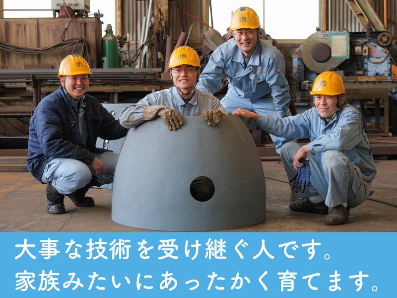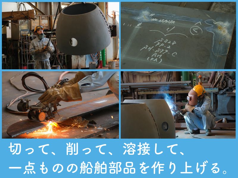 職場環境 \150年の歴史ある会社/ 安定・安心企業で長く活躍! 当社は明治8年、 船大工としてスタート。 造船や船の修理、煙突など 大きな船舶部品の製作する会社。 親子2代で働く職人も在籍。 今年だけで4名の新しい仲間を 迎え、社内も活気づいています。 喫煙所:喫煙所あり(屋外)