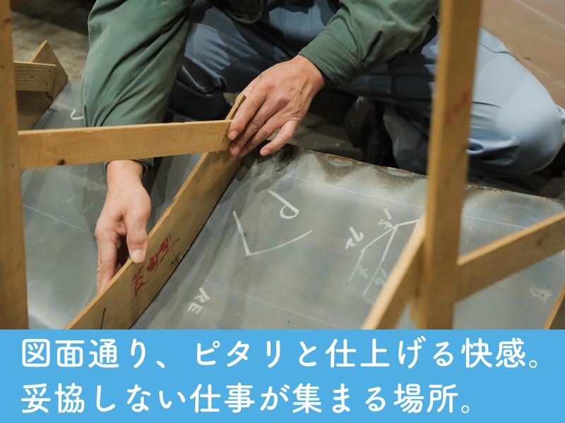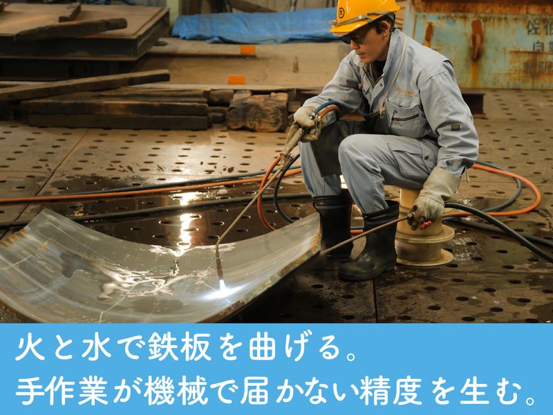 仕事内容 +++- ■船にロマンを感じるなら 今からでも船大工の道へ! -+++ 船をみるとなぜだかワクワクする… 子どもの頃、船の模型づくりに 夢中になったことがある… その憧れを仕事にしませんか? 海賊たち描いた大ヒット漫画でも 登場する「船大工」の仕事は、 現在も日本に息づいています。 特に日本が磨いてきた 手仕事の職人技は、世界でも 真似のできないものとして 賞賛されているのです。 私たちは、 明治初期から船大工として 培ってきた技術を受け継ぎ、 ここでしかできないものづくりを 続けている造船会社です。 +++- ■やってみないと実感できない 楽しさがある! -+++ 難しそう…自分にできるかな? 大丈夫です! ニッチな業界でむしろ 経験者を探すことの方が難しい(笑) まずは先輩の仕事を見てもらう。 工具などの使い方を教わりながら、 自分でもやってみる。 すぐにはできなくても、 繰り返すうちに「できた!」という 嬉しい瞬間は、必ず味わえます。 成功した時の感覚を忘れず、 身体で覚えることができれば、 技術者としての第一歩。 それを地道に積み重ねた先に 「真似のできない技術」という 高みが待っています。 +++- ■どの技術を磨いていくか 一緒に選びましょう! -+++ 当社の造船技術者は、 「プレス工」「製缶工」など 手掛ける作業ごとに担当を持ち、 その技術を磨いていきます。 配属は素養や希望を考慮し、 相談の上、決めていきましょう。 +++- ■プレスについて -+++ 各種プレス機を使って、 分厚い鉄板を曲げていく工程です。 600〜1500tの油圧プレス機で 荒曲げして、仕上げの手焼きに 引き継いでいきます。 プレスの段階でも 図面にあわせて作った木型に どこまで近づけておけるかで、 手焼き工程での負担も軽減できます。 +++- ■製缶について -+++ 各種船舶部品を 切断・穴あけ・曲げ・ 製缶・溶接・仕上げまで 一貫して形にする仕事です。 同じものと大量に作るのではなく 一点ものの製作が中心。 図面をもとに材料の切断から 曲げ加工、仮付け、溶接本付け、 仕上げ研磨まで、様々な工具を扱い 複数の工程を横断して携わります。 +++…………………………………… ■官公庁船舶の案件で誇れる仕事 ……………………………………+++ 自衛隊・海上保安庁・警察・税関など 官公庁の修繕案件が多数。 社会インフラを支える 船づくりに関われるため、 責任とやりがいは十分です。 技術で国を支える実感を得ながら、 長く続けられる専門職として 腕を磨けます。 +++…………………………………… ■政府の重点投資分野「造船」! ……………………………………+++ 現在、政府は造船業の再生を掲げて、 2035年の建造量倍増を目標に 動いています。 これは海洋国家として 貿易の99%を海上輸送に依存するほか、 中国の造船シェア拡大など 安全保障の観点からも 造船業の重要性が提唱されるように なってきたものです。 つい先日も 「造船は経済・安全保障を支える 極めて重要な産業」と指摘し AIや半導体とともに「造船」を 17分野の重点投資分野の1つに あげられました。 日本が培ってきた造船技術を守り、 この先も国の強みとして 持ち続けていく使命を 私たちも改めて感じています。 +++…………………………………… ■評価制度と成長ステップ ……………………………………+++ 年功序列ではなく、 良い仕事をすれば正当に評価。 役割や案件の幅が広がるほど 年収にも反映されます。 木曜はノー残業デー、 私生活と両立しながら 技を高められる環境です。 髪色・ひげも自由、 個性も生かしながら のびのび働けます。 +++…………………………………… ■雰囲気の分かる動画、あります! ……………………………………+++ テレビで当社の技術について 取材・紹介頂いた動画が YouTubeで公開中です。 手作業での曲げの技術を 中心に会社の雰囲気も 伝わる内容です。 「造るのは”船の前と後ろだけ”! 大田造船」と検索して、 ぜひ一度ご覧ください。