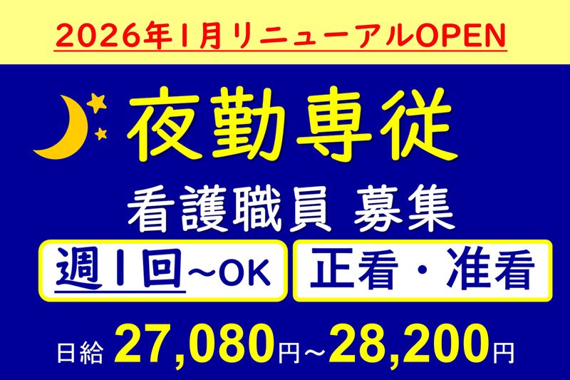 【アピールポイント】 2026年1月新築OPEN 「夜勤」新規スタッフ募集!夜勤は2名体制です! ■週1回からOK!(希望日数ご相談ください) ■Wワーク・副業もOK! ■介護未経験の方も歓迎! ■ブランクある方も大歓迎!