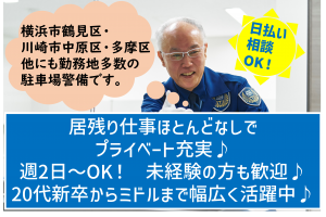インフォメーション 週2日~4日/平日のみ/土日のみ全部OK!未経験からアルバイト・パートで働きませんか? ☆一緒に働くメンバー募集中☆ ◇◇◇◇◇◇◇◇◇◇◇◇◇◇◇◇◇◇◇◇◇◇◇◇◇◇◇◇◇◇◇◇◇◇◇◇◇◇◇◇◇◇ ☆横浜市・川崎市のスーパー・ホームセンター での警備スタッフ募集☆ 20代・30代の若手から40代・50代のミドルまで活躍中! ◇◇◇◇◇◇◇◇◇◇◇◇◇◇◇◇◇◇◇◇◇◇◇◇◇◇◇◇◇◇◇◇◇◇◇◇◇◇◇◇◇◇ ☆ご質問・ご応募はこちらまでお願いします! 東洋ワークセキュリティ株式会社 横浜営業所 TEL:045-317-5033 もちろんWeb応募も歓迎です! ☆☆☆☆☆☆☆☆☆☆☆☆☆☆☆☆☆☆☆☆☆☆☆☆☆☆☆☆☆☆☆☆☆☆☆☆☆☆☆☆☆☆ 私たち東洋ワークセキュリティは、 全国に47拠点を展開し、 幅広いネットワークと培ってきたノウハウで、 皆様に「安全と安心」を提供しています。 警備のお仕事は「固そう・難しそう」といったようなイメージを持たれがちです。 しかし、実際は難しい動作や誘導はありませんし、重いものをもつ作業もありません! 簡単に覚えていただけるお仕事がほとんどで、 体に大きな負担がかかることもありません! そのため、社員の年齢層は幅広く、性別や経験も問わず活躍できます! 地域の安全と安心を守るために皆さんのお力をお貸しください! アピールポイント ☆★☆東洋ワークセキュリティの待遇☆★☆ 〇各種保険完備(法定通り加入) 社会保険にはすぐに加入していただけます。 扶養家族の方も加入していただけます。 ご相談ください! 〇残業ほぼなし! 残業はほとんどありません。 また、お仕事の持ち帰りや緊急対応も ほとんどないため、 退勤後はゆっくりプライベートの時間を 過ごせます。 〇充実の研修制度で未経験でも安心 多くの人が警備経験なしの状態で スタートしています! 業務に就く前にしっかりと研修を受けられる ため不安をなくして働けます。 〇直行直帰可能 ご自宅と会社が遠い方もご安心ください。 就業場所までは直接向かっていただけます! もちろんたまに会社に顔を出していただく のも大歓迎です♪ 〇入社後の資格取得を応援! 警備のお仕事には資格もいっぱいあります! もちろん資格取得費用は全額会社負担、 合格のための講習会も開催します。 合格した方には資格手当を お支払いいたします! 〇充実の福利厚生 福利厚生倶楽部に加入できるので飲食店や 映画館などで様々な優待を受けられます。 年2回のミニボーナスや 備品・空調ウェア・防寒着・制服無償貸与も嬉しい特典♪ 〇この求人は東京エリア採用強化求人です! 当社では東京・神奈川・千葉エリアでの 募集を強化しております! ☆★☆東洋ワークグループについて☆★☆ 東洋ワークセキュリティは1976年に創業した従業員8,500名を超える東洋ワークグループ(TWG)の一員です。 TWGは、「Work(仕事)」を開発することで、多様な「人財」が活躍し「Work」に関わるすべての人々のやりがいと、物心両面の幸福「Well-being」を追求しているグループです。東北からグローバルに事業を展開する企業として、未来が求める多様な働き方やライフスタイルを推進し、また既存の事業にとらわれない“革新的”な“Business Developer”として働く人と共に成長し幸福を実現します。 【事業領域】 ■HRセグメント 東北地方における人材ビジネス業界のパイオニアとして、派遣、請負、人材紹介、国際事業などを通じて、人と組織にかかわる多様なサービスを提供しています。インドネシア法人によるアジア圏の人材採用も展開しています。 ■SEC(Security)セグメント 東北最大級のマンパワーを強みとし、警備を主体とする総合セキュリティ事業、建物サービス事業、防犯・安全管理システム販売事業、保安用資器材レンタル事業の4分野を軸に展開しています。 ■SBE(Social Business Enterprise)セグメント SBEとは、障がい者や長期失業者など、 特に雇用を得にくい人たちを優先的に雇う企業の意味です。東洋ワーク株式会社の洗浄事業として始まり、2010年に東洋ワークグループの特例子会社として事業独立。洗浄事業を通して、障がい者に安心して働ける機会を提供し、自立を支援しています。 ■Abroad(海外展開) 人材確保から海外進出支援まで、アジア圏でのビジネスをプロデュースしています。法人設立以来、アジア圏で人材開発や市場参入支援に取り組んできました。時代に先駆けてアジアに目を向けたのは、日本の少子高齢化による労働人口の減少を見据え、国内の人材不足や市場縮小を解決する手立てを海外に見出したフロンティア精神から。中でもインドネシアでは、日系企業160社以上とコンサルティング契約を結ぶなど、アジア圏でのビジネスをサポートしております。 自分力バロメータ コミュニケーション力 協調性 理解力
