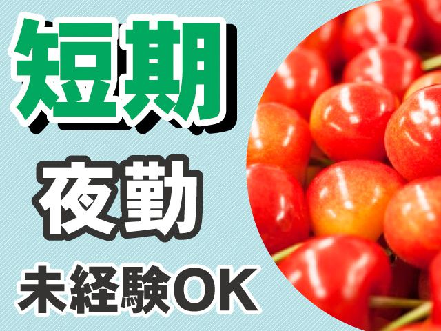 仕事内容 短期アルバイト募集中! 【期間】2026年6月初旬頃~2026年7月15日頃まで 夜からの短時間! 青果市場にて、さくらんぼの荷分けのお仕事です。 簡単作業のため、お仕事ブランクがある方も安心です。 短期アルバイトをお探しの方はもちろん、 Wワークをお探しの方にもピッタリ! 旬のフルーツをお届けする仕事に携わってみませんか? <ポイント> ・未経験OK 特別な経験、資格は不要です。 ・夜からのお仕事 夜勤でしっかり稼ぎませんか? ・幅広い年代が活用中の職場 学生さん、主婦(夫)、シニア(中高年)世代の方などが多数活躍中!