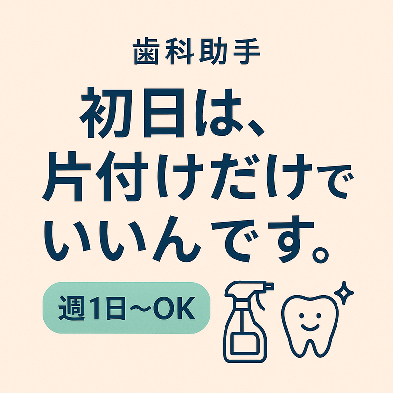 仕事内容 ✨未経験・バイトデビュー歓迎✨ 週1日~OKで学校・家庭とも両立しやすい! 「まずは簡単なお仕事から」で安心して始められます♪ <お任せするお仕事内容> ✅患者さまのご案内や誘導 ✅診療のサポート(器具の準備・受け渡しなど) ✅診療後の片付け・器具の洗浄・整理整頓 ✅院内の清掃 など 未経験から始めた先輩も多く、 サポート体制も充実しているので 安心してスタートできます♪ \当院で働くポイントをご紹介/ ①未経験からでも安心♪ まずは簡単なお仕事から! 器具の片付けや準備などから 始められるので 未経験・ブランクがある方でも大丈夫◎ ②週1日~無理なく働ける! 学校や家事・育児など、 プライベートと両立しやすく、 ライフスタイルに合わせてシフトを調整できます。 ③日曜勤務は手当あり! 「効率よく収入を得たい」方にぴったり♪ \よくある質問にお答えします/ Q:未経験でも大丈夫ですか? A:はい!今いるスタッフも ほとんどが未経験スタート。 器具の名前から丁寧に教えてもらえるので 安心してください! Q:学校や家庭と両立できますか? A:できます!実際に「授業後だけ」 「子どもの行事に合わせて」 などライフスタイルに合わせて 働いているスタッフが多数います。 Q:どんな雰囲気ですか? A:アットホームで声を掛け合える環境です。 困っていたら自然と手を貸してくれる仲間がいます。 Q:応募に必要なものは? A:特別な資格や経験はいりません。 “やってみたい!”という気持ちがあればOK! バイトデビューも応援します◎