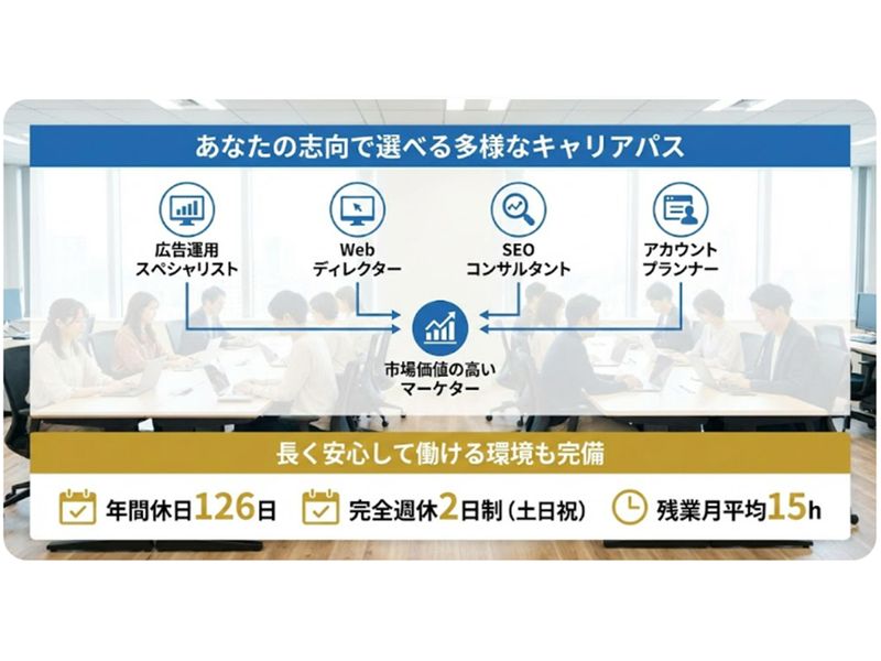 WEB広告のプロへ/賞与5ヶ月分/年休126日/残業1分単位