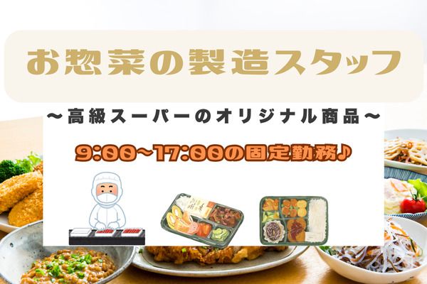 仕事内容 ~お惣菜製造スタッフ~ ■お惣菜の調理補助 (食材のカット、加工など) ■盛り付け、パック詰め ■商品の包装 ■片付け など <こんなお店♪> 輸入食品やオリジナル商品を多数取り揃えている 高級スーパーの食品工場。 できたてのお惣菜や オリジナル商品のスイーツ・ケーキも大人気◎ ___________ <来社・履歴書不要!> ご自宅などで安心&リラックスして登録していただけます! 一度ご登録いただければ、 ▼新着のお仕事を定期配信 ▼エリア/ブランド/勤務期間 幅広くご紹介◎ ▼いち早くメール・LINEにて配信中です♪ ご登録はご予約制で、ビデオ通話にて行います◎ まずはご応募ください♪ ___________
