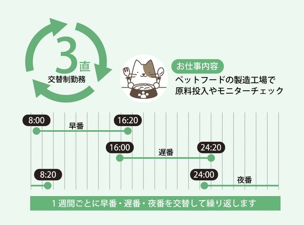 勤務時間 固定時間制 【3交替】 8:00~16:20 16:00~24:20 24:00~翌8:20(各時間休憩あり) ※休憩有 【3交替】 ①8:00~16:20(休憩あり) ②24:00~翌8:20(休憩あり) ③16:00~24:20(休憩あり) ①~③で1週間ずつの交替勤務です! 正社員の方とニコイチで仕事するので、 不安なこと、分からないことは、 すぐに聞けるので安心して働けますよ♪ 【勤務期間】 長期(3ヶ月以上) 即日~