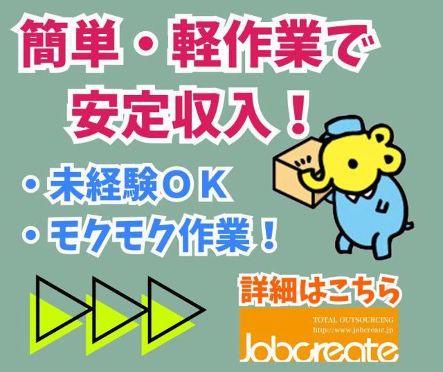 仕事内容 【東大阪市】【63015】 駅チカ!きれいな工場で 化粧品の検査・梱包作業♪ 週4日~時短応相談可! ◆当社オープニングスタッフ募集! ◆くり返しかんたん軽作業 ◆土日祝 長期休暇有 ◆重量物少な目♪ ◆週4日~相談可 【お仕事内容】 作業内容はいたってシンプル♪ 化粧品がレーンより流れてくるので 一つずつ手に取っていただき 目視検査・化粧箱に梱包・シール・ラベル貼り 決められたことをくり返ししていただく とってもかんたんな軽作業になります♪ 1個あたり1キロ未満がメインになりますので、 身体への負担も少な目です♪ スピードもそこまで早くないので、 未経験の方でも即戦力間違いなし! 現場に椅子も用意されているので、 座りながら作業もOK 【アクセス】 近鉄けいはんな線吉田駅から 徒歩3分 JR西日線 片町線 住道駅から徒歩40分 ■バイク・自転車通勤OK♪ **-** ジョブクリエイトは 大阪府高槻市にある派遣会社です。 製造、倉庫内、梱包などの軽作業はもちろん オフィスワークや販売促進など 豊富な人材サポートを行っております! 阪急高槻市駅から歩いて3分♪ 来社不要のWEB面談も実施しております! ご希望の方はお気軽にお申し付けください☆ **-** <自宅から面接ができるWEB面接実施中> <apアプリポイントプレゼント!> 日々のお仕事でポイントがたまり、 日用品や家電、食品、旅行券などの 商品と交換していただけます! ※土日祝日に頂いたご応募に関しましては、 翌営業日に順次対応させていただきます。 **-**