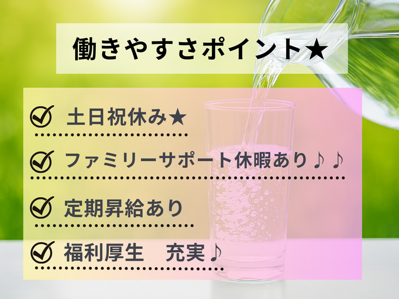 仕事内容 ◎大手上場グループ会社で安定勤務 ◎充実した休暇制度&福利厚生 ◎ファミリーサポート休暇あり ◎未経験から活躍している方多数! - 水道などで使用するお水の検査をする部門の スタッフ募集になります。 経験や知識はなくても大丈夫です♪ 入社後、丁寧に教育をしますので 安心してご応募ください。 ガラス器具(ビーカーなど)や、 検査用の薬品を使用して、 お水の成分を調べるお仕事です。 検査が完了した結果を 記録していただく作業もあります。 作業手順は社内できちんと管理されています。 慣れるまでは、先輩や社員の方が 丁寧にサポートしますので、 安心して取り組めます♪