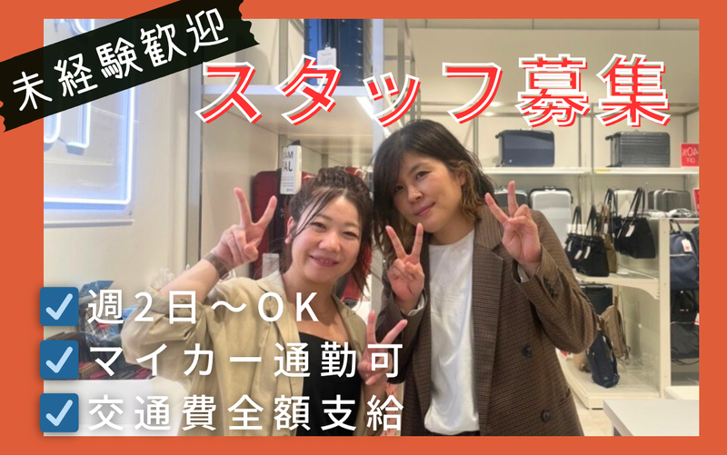 仕事内容 <一押しポイント> ✅販売未経験からスタートできる ✅ライフスタイルに合わせて働ける ✅個人ノルマがなく協力プレー <業務内容> バッグの接客販売をメインとした 店舗運営をお任せします* ・接客販売 ・品出し、商品陳列 ・在庫管理、ストック整理 ・店内の清掃 まずは笑顔でご対応からスタート♪ 先輩スタッフが手厚くサポートします! 遠慮なくお聞きください^^ <働き方> 扶養内~フルタイムまで大歓迎! 平日のみ、曜日固定 遅番固定などお気軽にご相談ください*