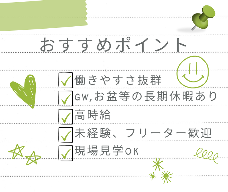 求めている人材 <こんな方にオススメ!> ■長期安定で働きたい ■日曜は休みたい ■GWやお盆、年末年始はちゃんと休みたい ■未経験者歓迎 ■ブランクOK ■久しぶりのお仕事復帰も応援!