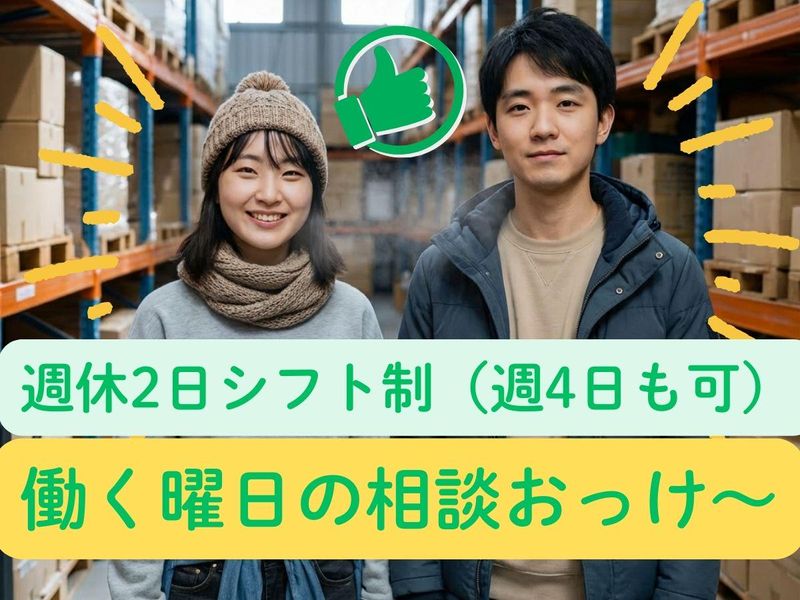 仕事内容 **✨**✨**✨**✨ 日勤×週休2日シフト制 7~21時の好きな時間で8h◎ 週4日勤務も相談OK ✨**✨**✨**✨** 物流倉庫での入出庫作業をお任せします。 ・入庫商品の荷下ろしと数量確認 ・商品ピッキング ・パレットへの積み付け(出庫作業) トラックで届いた商品の荷下ろしや数量チェック、倉庫内での商品のピッキングやパレットへの積み付けなど軽作業です。 リフト作業は専任のスタッフが担当するので、免許・資格は一切必要なし! 先輩スタッフがしっかりとレクチャー&フォローを行うので、倉庫作業が初めての方もご安心ください◎ ✅日勤帯のみ!働きたい時間を相談できるので、自分のライフスタイルに合わせて働くことができます。 ✅週休2日シフト制。出勤できる曜日を教えてください!週4日勤務も相談可能です。 ✅服装も自由!動きやすい格好でOKです。 ✅急な出費時にも安心!週払い制度あり◎ 20~40代の男女が活躍しており、もくもくマイペースにお仕事したいという方におすすめです◎ まずはお気軽にご応募ください!