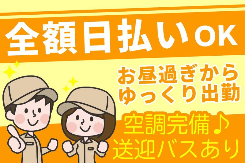 【保険制度】 雇用保険、労災保険、健康保険、厚生年金 待遇・福利厚生 【福利厚生】 ⭐⭐嬉しい全額日払いOK⭐⭐ ✅無料駐車場完備 ✅車・バイク通勤可 ✅無料送迎バス有 ✅食堂有り ✅Wワーク可能 ✅私服勤務OK ✅60歳定年制 ✅服装・髪型・髪色自由 ✅冷暖房完備