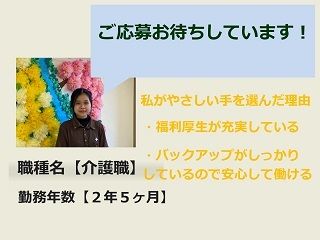 応募方法 ここまでお読みいただきまして、ありがとうございます。 ご応募は、『応募ボタン』にてお願いいたします。 <応募ボタン> 受付時間…24時間受付中!! ※ご応募内容を確認後、折り返しご連絡をさしあげます。 <採用選考スケジュール> ①応募 ②面接1回 ③内定(内定まで1週間程度) ※応募後、面接への日程調整をさせていただきます。 ※入社日も応相談ですので在職中の方も、まずはご相談ください。 【会社概要】 会社名:株式会社やさしい手 事業内容:介護事業・コンサルティング事業 年商:約210億円 社員数: 6,018人(常勤1,459人非常勤4,965人) ご高齢の皆様がご自宅で暮らす上での不安やお困りごと、その一つひとつを安心にかえるために、 皆様の立場になって生活のご支援をしてまいります。 「住み慣れた家で、最期まで生きる」その想いを、私たちが実現します。 担当 採用担当