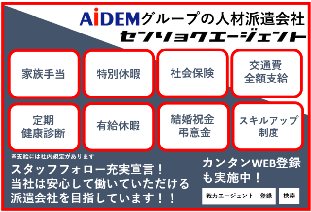 選考プロセス 登録➡面談(WEB面談)➡見学➡採用 【登録地】 朝日生命ビル 所在地:大阪府枚方市大垣内町 担当者:村上 麻央 電話番号:07036208576 メールアドレス:m_murakami@senage.co.jp お気軽にご連絡ください。