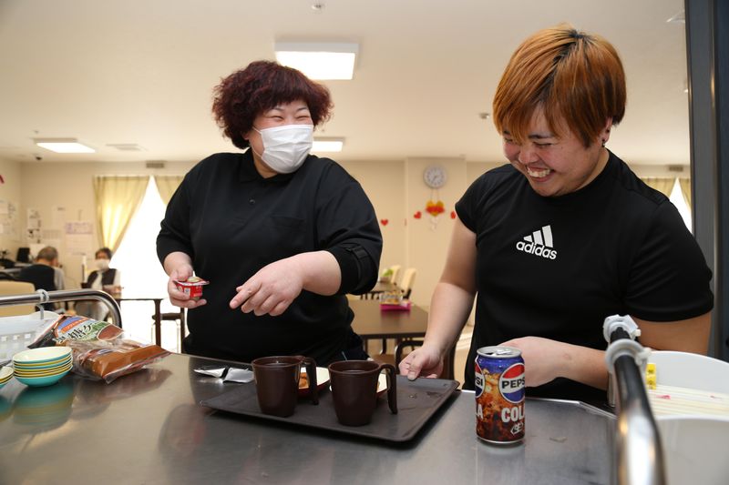 老人ホームのキッチンでの盛り付けスタッフ