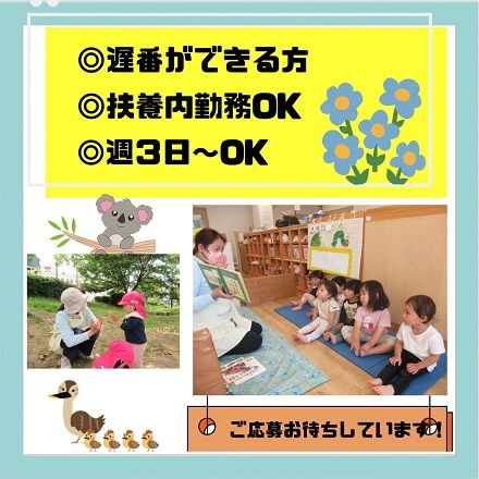 【時間】 週3日以上 【勤務時間】 週3日以上/シフト制 開園時間:7時30分~19時30分 シフト例: (遅番)13時~18時30分 14時30分~19時 1ヶ月の労働時間:60~120時間/月 【勤務期間】 ・雇用期間の定めあり:初年度、年度末まで(~3/31)・以降、原則契約更新(勤務成績・能力・会社状況等により判断) ・更新上限回数/通算契約期間上限:採用より1年経過後の次の年度契約更新時に原則無期雇用契約(対象外:再雇用制度による継続雇用者・学生・期間限定業務従事者) ※対象外に該当する方は面接時に説明します