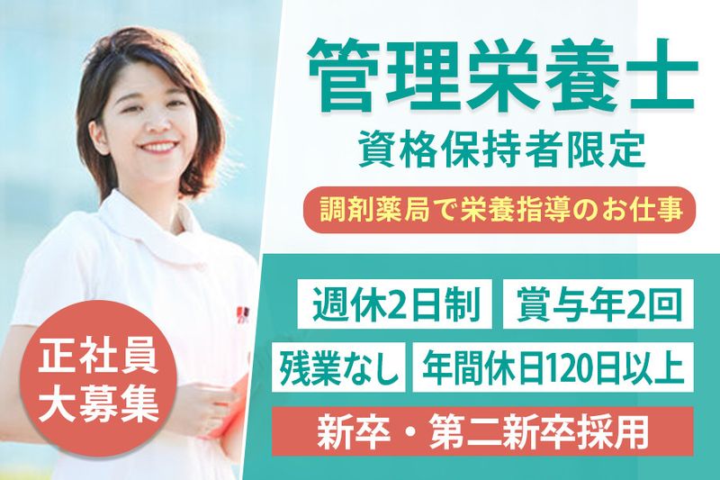 【アピールポイント】 \未経験・新卒・第二新卒応援/ 保険調剤薬局で新卒管理栄養士を正社員で募集! ■資格取得支援制度あり ■賞与年2回 ■残業なし ■明確な評価制度 ※管理栄養士資格お持ちの方限定※