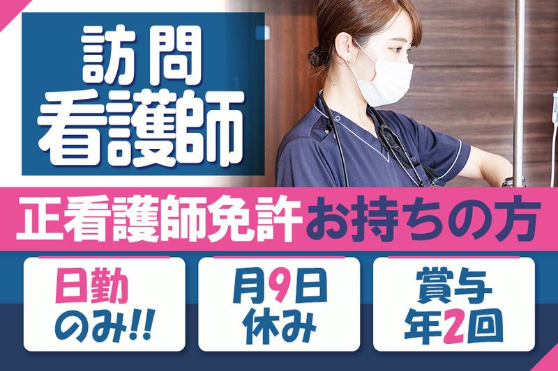【アピールポイント】 訪問看護ステーションで常勤の訪問看護師を募集! ※正看護師免許お持ちの方※ ◎賞与年2/手当+福利厚生充実◎ ◎訪問看護未経験+ブランク応援
