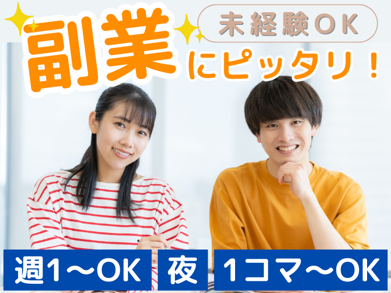 勤務時間詳細 1日1コマ~OK! Aコマ 17:10〜18:10 Bコマ 18:30〜19:30 Cコマ 19:40〜20:40 Dコマ 20:50〜21:50 ⭐週1日~OK⭐ 「平日夜に副業として」 「土曜の夜だけ」など、 ライフスタイルに合わせた働き方が可能 希望はぜひお聞かせください。 ※固定の曜日・時間に 必ず勤務ができる方は尚歓迎◎