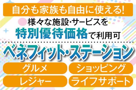【保険制度】 雇用保険、労災保険、健康保険、厚生年金 待遇・福利厚生 【福利厚生】 ・社会保険完備 ・交通費全額支給 ・バイク通勤OK(規定) ・ガソリン代補助あり ・無料送迎バスあり ・有給休暇 ・制服貸与 ・食堂、売店あり ・喫煙室あり ・結婚祝金、出産祝金、こども手当、入学祝金、退職金制度などの福利厚生が充実(規定) ・紹介キャンペーン ※ご紹介くださった方1名につき5万円を進呈(規定) 【ベネフィット・ステーションの利用が可能】 ベネフィット・ステーションとは、 様々なシーンでご利用いただける 総合型福利厚生サービスです。 映画鑑賞やホテルディナー、宿泊施設 などの余暇・レジャー関連をはじめ、 日常で使えるフィットネスや 育児・介護支援、ライフサポートなど 約140万件以上の幅広いメニューを お得な価格で利用できます。 <サービス例> ・全国40,000以上の宿泊施設 ・全国30,000店舗以上の飲食店 ・全国約7,700ヶ所のスポーツクラブ など スタッフさんはもちろん、ご家族の方もお好きなだけ利用できます。