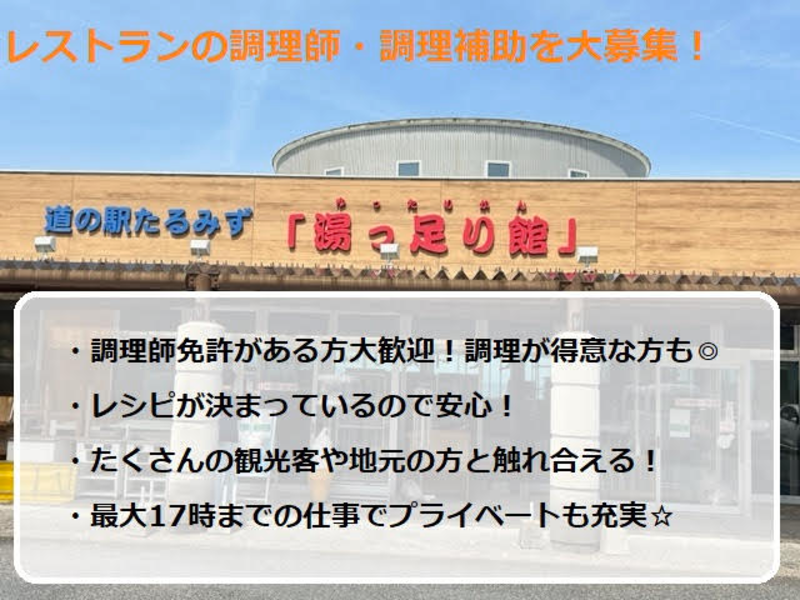 仕事内容: \家庭と両立しながら働ける◎/ 主婦(夫)さん多数活躍中♪ 資格・ブランク不問 17時までの調理スタッフ募集! ✧ここがオススメ✧ ・9:00スタートで朝もゆっくり ・17時までで家庭と両立しやすい ・お子さんの予定などシフト相談OK ・ブランクがある方も歓迎 ・正社員登用制度あり ■仕事内容 道の駅内レストランで 調理業務をお任せします。 <具体的には…> ・簡単な調理や盛り付け ・食事の配膳 ・食器洗浄 など 難しい作業は少なく、 これまでの調理経験を活かせるお仕事です。 ✦・┈┈┈┈┈┈┈┈┈┈┈ ・✦ 道の駅たるみず 湯っ足り館とは ✦・┈┈┈┈┈┈┈┈┈┈┈ ・✦ 日本最大級の足湯や天然温泉、 レストラン、物産館が併設された 活気ある複合施設です。 観光客だけでなく、地元の方の 憩いの場としても親しまれており、 ドライブ途中の休憩や買い物、 温泉利用など幅広い層に利用されています。