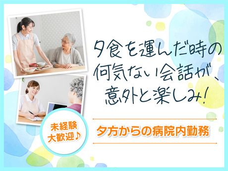 仕事内容 【準夜勤看護助手】介護・看護の経験が活かせます!身体の負担も少なく、40代50代の女性が活躍中♪ ▼お仕事内容▼ *患者様の見守り *食事の配膳・下膳 *物品等の管理・準備 *おしぼり配布 *環境整備 *シーツ交換 など 「久々のお仕事復帰」も大歓迎♪ 先輩スタッフがサポートします!! 【1日のスケジュール(例)】 15:15~/出勤、お仕事開始! 16:00~/検査室への患者様移送 17:00~/患者様の病食やお茶の準備 18:00~/下膳やお薬の配布 19:00~/シーツやリネン類の交換・補充 ( 合間に休憩 ) 21:00~/病室のゴミ捨てや簡単な清掃 ~22:00/お仕事終了!残業せず退勤♪ 医療の知識や資格のない方でもできる 簡単な軽作業が中心です! 入社後は先輩スタッフがついて 丁寧にお仕事を教えていきます。 分からないことはその場で 質問いただいて大丈夫です◎ 患者様に「おやすみなさい」を伝えるお仕事、準夜勤…今人気があります!! 【 人気の理由は!? 】 ・お昼すぎから日付変わる前の働きやすい時間帯 ・夜勤はないのでリズムも整う ・しかも深夜割増時給で稼げる お子様が成長して日勤から切り替える、なんてスタッフも大勢♪ 効率よく、しかし無理なく!お仕事して稼ぎませんか?^^ <こんな方が働いています♪> ★元介護職の40代女性★ 結婚するまでは介護の仕事で 夜勤もこなしていました。 もう年も年なので夜勤はきびしい… でも夕方からの準夜勤なら 高時給で効率よく稼げるので 日勤よりもお得感あります♪ ★元看護師の50代女性★ 子供が大学のために上京して いろいろとお金がかかるので 久しぶりに仕事を再開しました。 看護師は時間が不規則だし 夜勤だと身体がつらくて… 準夜勤の看護助手なら 短時間でラクだし、 いろいろと知識を活かせるから 長く続けられそうです♪ \人柄重視での複数名の方を積極採用中/ <未経験からのスタート大歓迎!!> 事前に研修をしっかり行うので ブランクがある方はもちろん、未経験の方も安心です♪ 実際に当社でお仕事を始める方の約9割は未経験スタート! 制度を利用し、資格取得をされた方も多数いらっしゃいます♪ 今後ますます重宝されるスキルを今のうちから磨いていきませんか? <AK_C2>