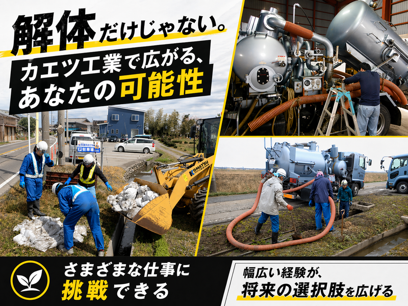 求めている人材 ✅【必須条件】 ・誠実さ、責任感を大切にできる方 ・周囲と協力しながら仕事を進められる方 ・分からないことをそのままにせず、聞いて覚えられる方 ・現場仕事のリアルを受け止め、安全第一で動ける方 カエツ工業が採用で最も重視しているのは、経験や資格よりも人間性です。特に大切にしているのは「誠実さ」「責任感」。利益だけを優先してお客様をないがしろにしないこと、嘘をつかず、まっとうに仕事に向き合うことを重視しています。 ✅【歓迎条件】 ・解体工事、建設現場、土木、廃棄物収集運搬などの経験がある方 ・中型免許、重機関連資格をお持ちの方 ・スポーツ経験など、体を動かすことに慣れている方 ・段取りを考えながら効率良く動ける方 ※ただし、いずれも必須ではありません。資格は入社後取得可能です。未経験者歓迎です。 ✅【こんな方に向いています】 ・真面目に、実直に取り組める方 ・言われたことを覚え、間違いがあれば修正できる方 ・一つの仕事だけでなく、幅広い経験を積みたい方 ・困っている人のために動くことにやりがいを感じる方 ・地域に根ざして長く働きたい方 ・将来的に現場の中核を担いたい方 カエツ工業では、スペシャリスト一本型よりも、変化を前向きに受け止め、マルチに動ける方の方が活躍しやすい傾向があります。解体工事を軸にしながら、環境事業部の幅広い仕事や会社全体のさまざまな動きに触れられるため、「いろいろな経験を通じて自分の可能性を広げたい」という方には合いやすい環境です。 ✅【ミスマッチになりやすい方】 ・利益優先で、お客様や仲間への配慮が薄い方 ・汚れや臭気など、仕事の環境に対応するのが難しい方 ・変化のある仕事より、同じ仕事だけを極めたい方 ・周囲に相談せず、一人で抱え込んでしまう方 この仕事では、最初に現実とのギャップを感じる方もいます。ですが、「汚れたら洗えばいい」と切り替えられる方、気持ちを整理して前に進める方は伸びやすいです。逆に、綺麗な環境だけを求めたい方には合いにくいかもしれません。 ✅【最後に】 今回の募集は、欠員補充だけではありません。人員不足で本来取れる仕事を取り切れていない状況を変え、将来的には環境事業部の中核を担っていただくことを期待した採用です。未経験からでも、真面目に学び、仲間と助け合いながら成長したい方。地域を支える仕事に挑戦したい方。そんな方からのご応募をお待ちしています。