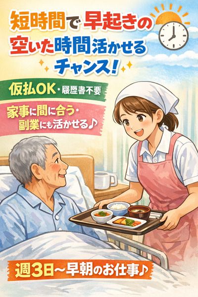 仕事内容 【選べる曜日&定時退社】綺麗な職場でスキマ時間に稼げる! <仕事内容> 病院内でのお仕事になります! 主な作業は、料理の盛り付け、配膳、戻りの洗浄などシンプルな作業がメインになります! お客様とは話す機会はありませんで、ご安心ください。 朝の5:30~9:30までの4時間勤務でスキマ時間を有効活用したい方にピッタリ! 未経験の方でも安心してスタートできるお仕事です。 就業前の職場見学も可能ですので、 安心してスタートできます! ご不明な点等ございましたら、 遠慮なくご連絡ください! :+:・-・:+:・-・:+:・-・:+:・-・:+:・-・:+: 【おすすめポイント♪】 ・制服一式貸与 ・原則定時退社でプライベートも充実♪ ・今までの経験を活かせる! :+:・-・:+:・-・:+:・-・:+:・-・:+:・-・:+: 【★充実のサポート体制★】 アイニードは業界内最高待遇を目指し、 毎日成長し続けています! エリア担当の専属コーディネーターがおりますし、 入社前に必ず職場見学もしていただきますので、 安心してスタートできます! 社会保険、有給休暇、日払い・週払いなどの制度充実しています♪ :+:・-・:+:・-・:+:・-・:+:・-・:+:・-・:+: 【日払い・週払いも制度あります☆彡】 急にお金が必要になった時でも大丈夫! アイニードでは、給与の日払い・週払いシステム制度を 使用することができます。 ★給与の一部を日払い・週払い ⇒ 残りは給与日にまとめてお振り込みいたします★ 最短で働いた日の2日後に振込致します♪ :+:・-・:+:・-・:+:・-・:+:・-・:+:・-・:+: