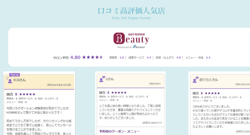 仕事内容 \ 9月OPEN → 10月積極採用中 / 「保証8,000円×歩合40%」で安定高収入。 “未経験でも3日でデビュー”できる、話題のドライヘッドスパ専門店。 そんなヘッドスパ専門店オムで一緒に働きませんか? ⭐.。。. HOMMEが選ばれる理由 .。。.⭐  ̄ ̄ ̄ ̄ ̄ ̄ ̄ ̄ ̄ ̄ ̄ ̄ ̄ ̄ ̄ ̄ ✅ 収入アップ: 客単価1万円超え、バックの好待遇(40%バック)+最低保証あり! ※月収40万円~60万円のスタッフも在籍 ✅ 自由な働き方: シフト制、Wワーク可、ノルマなし ✅ 指名が取りやすい: 月に100組を超える新規のご予約が入り、高単価のため、上質な客層を確立しています。 ※業界平均の8倍以上の広告投資を行い、圧倒的な集客力を実現。投資+独自のノウハウを活かし、安定した新規集客を確保 あなたを“売れるセラピスト”に育てる仕組みがあります。 ホットペッパービューティーでの口コミ評価は、驚異の≪4.75点≫ ⭐.。。. 仕事内容 .。。.⭐  ̄ ̄ ̄ ̄ ̄ ̄ ̄ ̄ ̄ ̄ ̄ ̄ ̄ ̄ ̄ ̄ ドライヘッドスパの施術 お客様へのカウンセリングや接客 店舗運営の補助業務(希望者は店長候補として昇格も◎) <<少しでも気になる方は“まずは応募だけ”でもOK!面談でご相談ください。>> ⭐.。。. 働き方は自由 .。。.⭐  ̄ ̄ ̄ ̄ ̄ ̄ ̄ ̄ ̄ ̄ ̄ ̄ ̄ ̄ ̄ ̄ 髪型や髪色もピアスも自由です。 制服も貸与しています。 自分の長所を活かしてお仕事できます! お客様の笑顔の為にはまずはスタッフから! 自分らしくお仕事できる楽しい環境で、 プロの技術を習得し、やりがいを感じていただける職場になっています。 ⭐.。。. 独自のマニュアルで安心 .。。.⭐  ̄ ̄ ̄ ̄ ̄ ̄ ̄ ̄ ̄ ̄ ̄ ̄ ̄ ̄ ̄ ̄ 「デビューまでの期間はどれくらいかかりますか?」 「スクールに通わされるんでしょ?」 そういった声を面接の時点でもよく聞きます。 当店には、独自の研修マニュアルがあり、未経験の方でも簡単にスタートすることが可能になりました。 リラクゼーションから医学的知識も習得できる本格ヘッドマッサージが、 3~5日の研修でできるようになるノウハウ、サポートがあるので、すぐにデビューしていただくことが可能です! 技術の取得は、もちろん無償でさせていただきます! 技術指導ではダイエット本では異例の10万部売り上げ日本一のあの今村先生が監修しました! ⭐.。。. スタッフの声 .。。.⭐  ̄ ̄ ̄ ̄ ̄ ̄ ̄ ̄ ̄ ̄ ̄ ̄ ̄ ̄ ̄ ̄ 「前職より収入が1.5倍になり、ストレスなく働けています!」(20代女性) 今の職場よりもっと良い環境で働きたい方、ぜひご応募ください! <<少しでも気になる方は“まずは応募だけ”でもOK!面談でご相談ください>> ⭐.。。.ヘッドスパオムについて .。。.⭐  ̄ ̄ ̄ ̄ ̄ ̄ ̄ ̄ ̄ ̄ ̄ ̄ ̄ ̄ ̄ ̄ ▼ホットペッパービューティー https://beauty.hotpepper.jp/kr/slnH000708293/ ▼ホームページ https://recruitment-headspa.studio.site/shinsaibashi