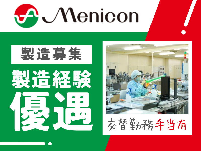 求めている人材 【必須条件】 ✅機械操作に抵抗がない方 ✅普通自動車免許(AT限定可) ✅工場ラインなので丁寧に作業ができる ✅素直に仕事に取り組むことができる ⭐性別・経験・スキル不問! どなたもお気軽にご応募ください。 【こんな方は活躍いただけます】 ・学歴不問 ・業界未経験の方 ・製造未経験の方 ・ブランク復帰、ブランクOK ・実務経験浅くてOK ・第二新卒、既卒の方 ・高卒OK ・コンタクトレンズの知識不問 ・機械操作、メンテナンス経験者 ・3交替勤務経験者 ・何事にもチャレンジできる方 ・メニコンが好きな方 ・コンタクト事業に携わってみたい方 ・Uターン、Iターンしたい方 新着求人、 ハローワークでお仕事をお探しの方にもピッタリ! 【こんな方が活躍中】 ・20代、30代活躍中 ・製造経験者 ・食品製造経験者 ・化粧品、衣料品製造経験者 ・未経験の方